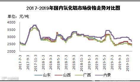 图3 2017-2019年国内氧化铝市场价格走势对比