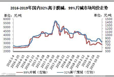 2019年12月中旬,山东大型氧化铝厂液碱订单采购价再度大幅下调,价格创三年新低,引发烧碱市场一片哗然。回顾2019年10月以来的走势,烧碱市场价格持续下跌,其中液碱已经跌至三年以来低位,片碱跌至2019年6月以来的新低。截至12月20日,国内32%离子膜碱市场均价在750元/吨,较9月底的年内高位下跌139元,跌幅为15.59%;99%片碱全国均价为2810元/吨,下跌250元,跌幅高达8.17%。