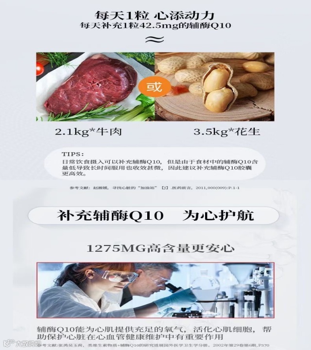 含量高:保健食品批文:每100克含辅酶Q10不低于21克,每一粒含约42.5mg的辅酶Q10,约等于2.1公斤牛肉,3.5公斤花生所含的辅酶Q10.高含量更安心。