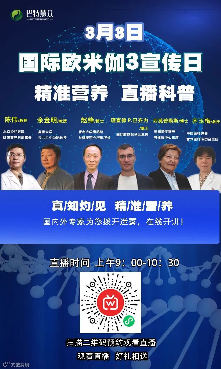 随着我国人口结构的逐步老龄化,国内心血管疾病的危害问题日益严重。为普及大众对于人体必需欧米伽3脂肪酸的认识,巴特慧众集团特邀美国哈佛医学院脂类医学技术中心博士后研究员赵锋博士于2021年3月3日上午9:00-10:30为大家做在线直播讲解,希望大众能通过专家的讲解,对欧米伽3脂肪酸的定义及对心脑血管疾病的预防和康复作用有一个全面深入的了解。关注心脑血管健康,期待您的莅临。