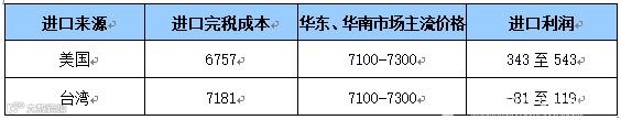 表1 进口利润核算(单位:元/吨)