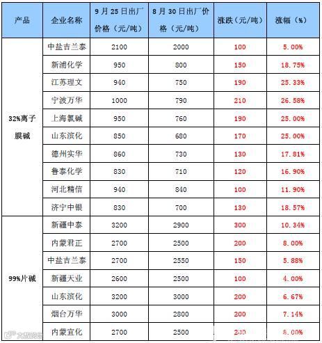 从表1来看,国内主要烧碱厂家纷纷上调出厂报价,其中中盐吉兰泰等厂家曾在一个交易日内两度上调报价,心态强烈可见一斑。在开工基本稳定、市场供应充足的背景下,厂家之所以迅猛上调出厂报价,主要是受江苏危化品禁运消息影响。自9月20日起,江苏地区禁运危险品,在无法就地处理烧碱副产品液氯的情况下,当地部分烧碱企业只能选择降负荷或停工,烧碱供应预期大幅减少。因此,江浙一带烧碱企业惜售心态强烈,自9月初开始,大幅轮番上调出厂报价,其中涨幅最大的要数宁波万华。