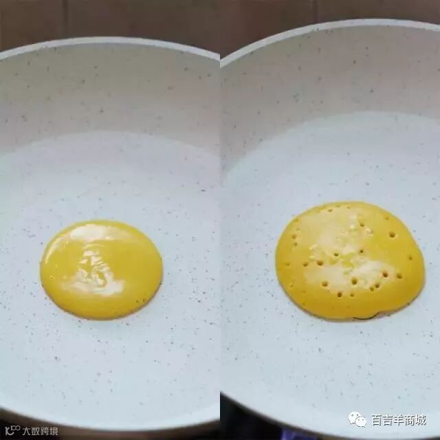 ✦3、准备一个平底锅,锅内不用倒油,将搅拌好的面糊用勺子挖一勺面糊,让面糊匀称自然的滴下形成圆形,等到一面起小孔,再用刮刀翻面继续煎就可以了。(煎南瓜松饼时,一定要耐心,慢慢练习就可以煎好了)