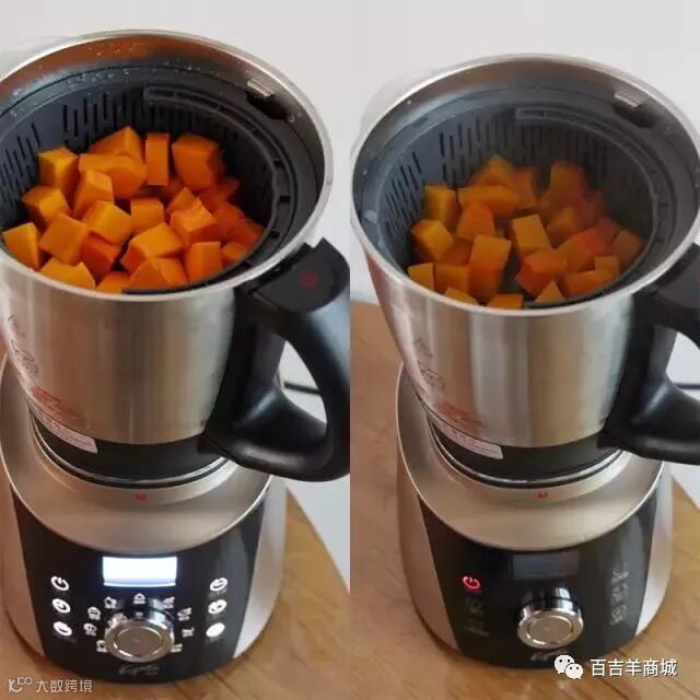 ✦2、将蒸熟的南瓜和鸡蛋羊奶倒入破壁机容杯,留一部分南瓜预备做奶昔。