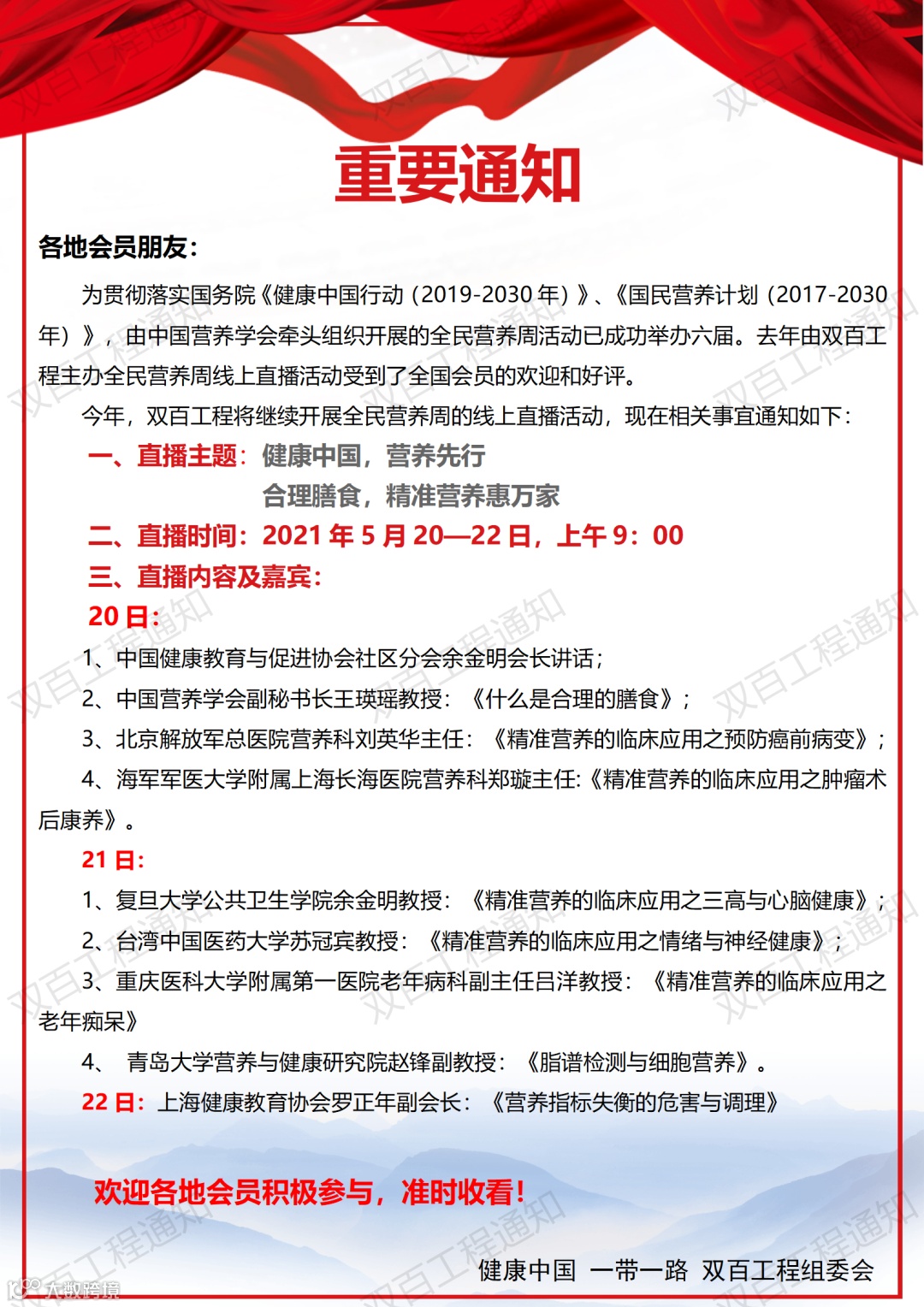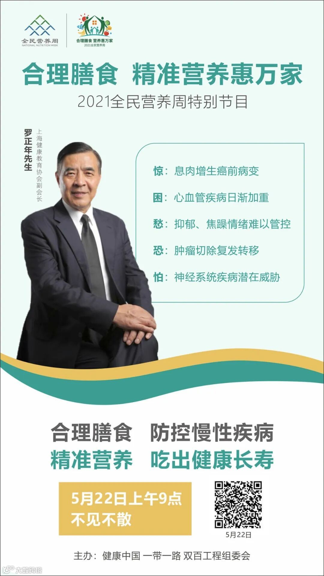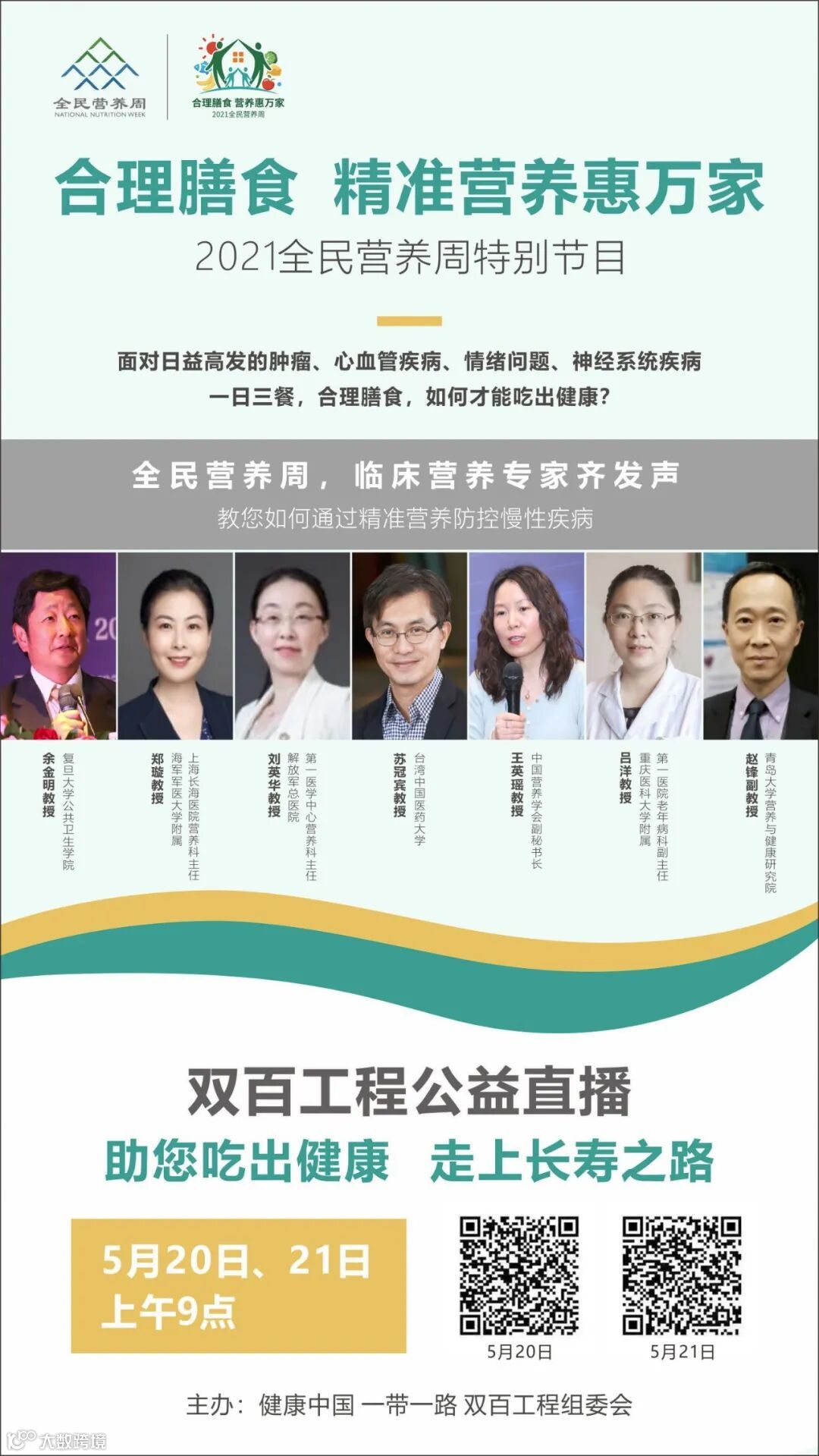 为响应习主席“健康中国2030”规划纲要,贯彻落实国务院颁布的“2030《国民营养计划》中提出的”坚持以人民健康为中心,普及营养健康知识”的重要思想。巴特慧众集团做为营养健康和合理膳食的支持者和倡导者,在2021全民营养周全网公益直播——合理膳食 精准营养惠万家特别节目。通过本次公益直播倡导均衡营养和健康生活方式。