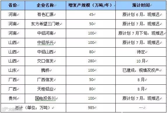 表1 2019年国内氧化铝增复产统计