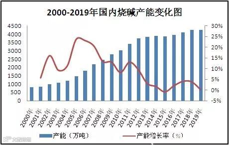 图2 2000-2019年国内烧碱产能变化图