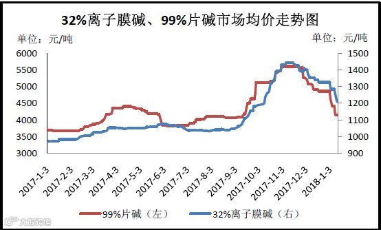 自2017年11月15日我国实行采暖季限产以来,下游氧化铝企业开工受限,终端需求下降拖累烧碱走势,市场价格频频走低。据广东塑料交易所统计,截至2018年1月18日,国内32%液碱市场均价跌至1207元/吨,较2017年11月15日的历史高位下跌237元/吨,跌幅16.38%;99%片碱市场均价在4150元/吨,下跌1450元/吨,跌幅25.89%。