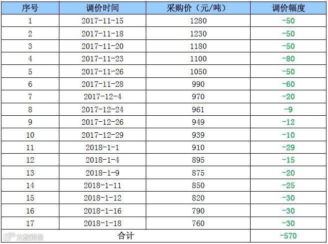 作为烧碱的重点下游行业,氧化铝限产直接导致市场从之前的卖方市场转为买方市场,氧化铝企业议价能力加强,特别是山东地区氧化铝企业魏桥,其32%液碱采购价格变动直接主导着烧碱价格的走势。自11月15日以来,魏桥17次下调32%液碱采购价格,从1330元/吨下跌至760元/吨,下跌570元,跌幅高达42.85%。面对液碱采购价格频频走低,国内烧碱企业只能被迫下调销售价,否则将面临货源无法销售的局面。