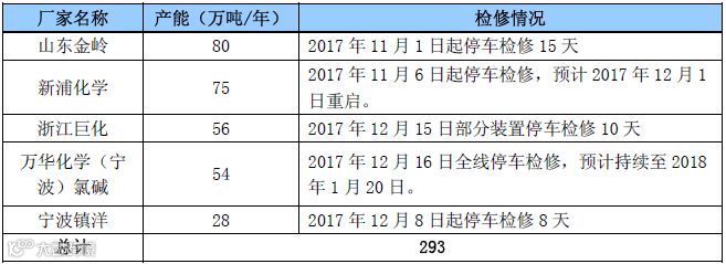 自2017年11月中旬以来,我国8省34市实行《2017-2018年秋冬季大气污染综合治理攻坚行动方案》,实行时间为2017年11月15日至2018年3月31日,下游铝工业企业(包括电解铝、氧化铝、铝用碳素企业)实施限产,电解铝企业限产30%以上;氧化铝企业限产30%以上。截至2017年12月,全国氧化铝运行产能7343万吨/年,其中减产产能占全国总产能的18.51%。按照2016年全国34%的烧碱产量流向氧化铝行业来算,预计采暖季每月烧碱市场需求将减少16.68万吨,占全国烧碱月度产量的5.9%左右。