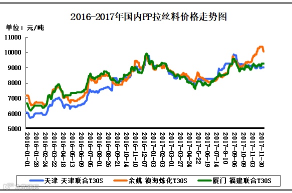 2017年国内PP期市呈现先跌后涨的趋势。2017年年初PP价格稳居市场高位,春节前后下游订单减少,开工率维持低位,对PP的有效需求明显下降,而库存居高不下,维持85万吨以上,导致PP进入单边下跌行情,余姚T30S由年初的9300元/吨,跌至7月的8150元/吨,跌幅达12.4%。在2017年7月左右,随着PP需求旺季的到来和装置检修高峰的提前,PP供需矛盾逐渐得到缓解,行情开始震荡上扬。12月底,余姚T30S涨至10375元/吨,较7月上涨2225元/吨,涨幅高达27.3%。
