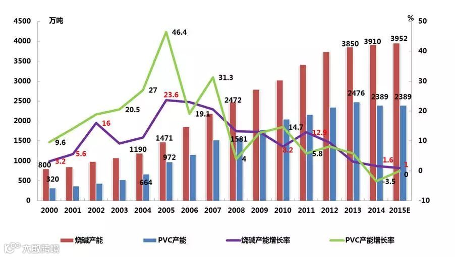 近几年,中国氯碱行业产能扩张经历了从快速增长到逐步放缓的过程。统计数据表明,从2000年到2015年这15年内,我国烧碱的产能从800万吨增长到3952万吨,增长到近5倍。PVC产能从2000年320万吨增长了近7.5倍。其中,2004年-2007年是烧碱快速发展的过程,从2010年以后烧碱和PVC产能逐步放缓。2014年,PVC的产能首次出现了负增长。