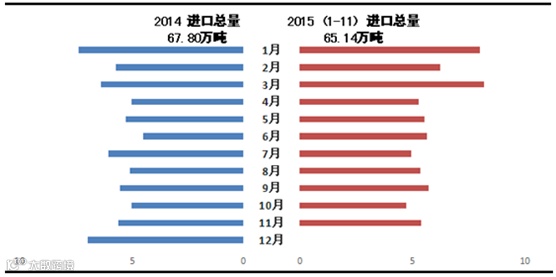 2015年1-11月我国PVC累计进口量为65.14万吨,累计进口金额为57921.88万美元,累计进口均价为889.11美元/吨,与上年同期数量相比增长6.99%。近年来,国内PVC供应基本饱和,然而进口高端料的缺口依然存在,2015年第一季度,受新年影响,进口量相对较多,后随着国内PVC供应的陆续恢复,整体维持稳健的进口量,仅7月份进口下滑幅度较大。