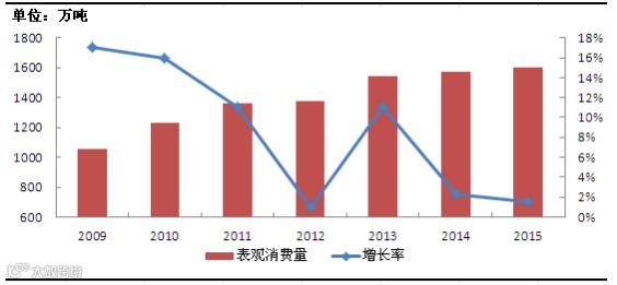 2015年PVC表观消费量受房地产新政及国内基建投资增长等各方面影响,PVC制品产量增长情况要明显好于整体塑料制品的增幅,但是整体增速有所放缓。塑交所统计数据显示2015年PVC表观消费量约为1600万吨,同比增幅仅1.5%。