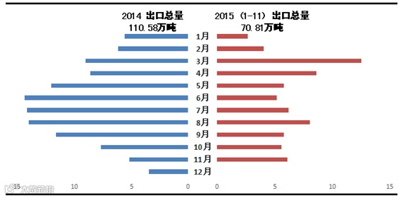 2015年1-11月累计出口量为70.81万吨,同比下降33.92%。累计出口金额为55909.1万美元,累计出口均价为789.56美元/吨。2010-2014年我国PVC出口增长率为48.78%,增速较快,但是由于我国PVC出口地较为单一,2014年6月份开始,印度对我国大幅增加反倾销,受此影响,2015年PVC出口量大幅下降。