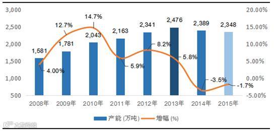 自2014年起,PVC行业拐点正式出现,产能退出87万吨,行业内首次出现负增长。2015年落后淘汰产能继续,至2015年12月底,PVC产能共计2348万吨,其中新增78万吨,退出119万吨,同比去年减少41万吨,其中电石法产能1918万吨,占82%,乙烯法430万吨。PVC生产企业81家,同比减少7家,其中正式退出9家,新增2家。