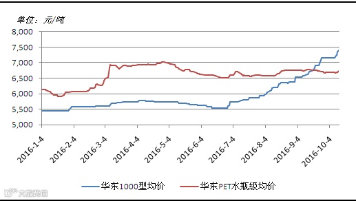 2016年1-10月 乙烯法PVC与PET价格走势图