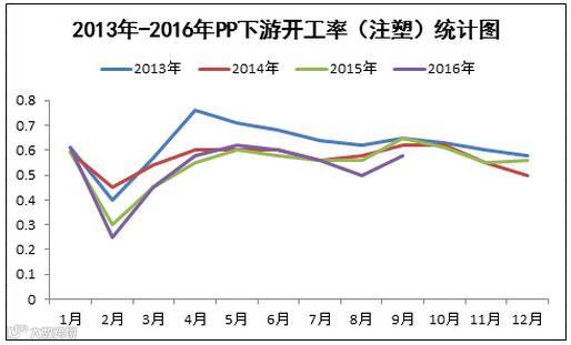 从供给方面上看,截至2016年9月30日,国内PP粒料总产能为1843万吨/年。10月PP市场供应与上月相比,呈现增长的态势。一方面,9月开始前期检修的装置开始陆续开启,10月将会稳定出货,加之10月无装置检修计划,装置损失较少。另一方面,新装置的投产带来的供应增加。新疆神华(45万吨/年)在国庆期间已开车,近期将会产出合格产品销往市场。另外,中天合创PP环管法装置(35万吨/年)在9月底已开车生产拉丝,预计月产2万吨,调拨1万吨。这两家公司的产品都将在10月中旬开始投放市场,届时市场供应会有所增加。