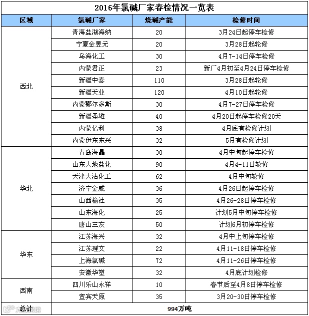 相比往年,2016年氯碱厂家集中春检对烧碱行情的支撑作用弱化。