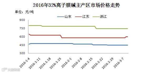 2016年一季度三大液碱主产区行情走势情况如下: