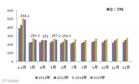 结合国内烧碱2015年1-6月分月产量数据来看,2015年烧碱月产量已经有明显放缓的态势,每月产量较2014年均有不同程度下滑。