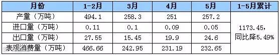 面对持续低迷的国内外宏观经济环境,市场商家悲观心态浓厚,烧碱下游印染、化纤等需求行业维持较低的开工率,因此对烧碱的贡献率不断降低;但氧化铝行业却一改近五年持续下滑的开工率,从2010年76%的开工率下滑至2014年的70%,而在2015年逆市升至82%。尽管氧化铝行业产量同比增13.10%,但在造纸、平板玻璃、印染等需求行业出现负增长拖累下,烧碱下游需求整体疲软态势也未有实质改观。2015年1-5月表观消费量为1173.45万吨,同比降5.49%。