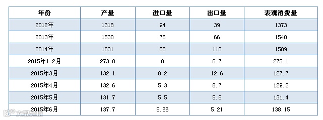 2012年-2015年国内PVC表观消费量对比表 单位:万吨