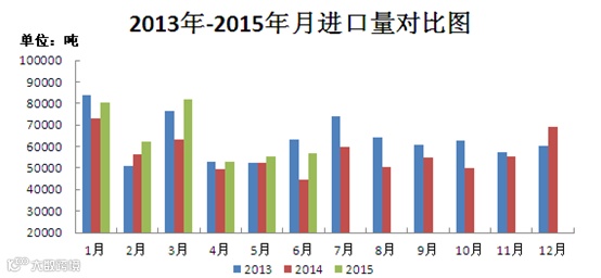 上半年,我国PVC粉进口较去年同期有小幅增长。据海关统计数据显示,1-6月PVC粉累计进口量为38.97万吨,同比增长15.02%。进口的主要增长期集中在2-3月,当时国内电石法市场价格出现大幅上涨,而国际市场的价格较为平稳,进口货源与国内市场价格相差大为缩小,故导致进口货源大量涌入,造成上半年进口总量达到近两年的高位。但到了5-6月份,国际市场PVC行情仍以普遍阴跌为主,价格支撑略显无力。但环地中海地区供应紧张,主流价格出现每周一涨的局面,反之此时国内PVC价格迅速下跌,进口货源失去相对价格优势,进口出现明显回落。7-9月,作为PVC进口大国的印度适逢雨季,需求降低,若此时国内PVC市场价格上调,进口量有可能会再次大增。