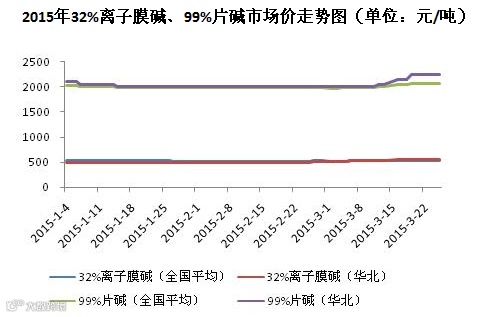 如上图所示,笔者选取了华北、西北、华东三个烧碱主产区的平均价与华北单区进行对比。发现32%离子膜碱价格走势基本重合,唯有华北99%片碱价格在3月下旬价格上行的幅度相对大点。据笔者与市场人士联系得知,因当地液碱推涨的幅度较大,导致片碱企业生产成本增加,另外,齐鲁石化部分烧碱装置停车检修,高浓度碱在这期间缺货,导致片碱上游原料供应紧张,多重因素推动了当地片碱价格涨价幅度较大。而西北片碱生产由于有原盐、电力等资源成本优势,片碱价格提涨的幅度较小,全国99%片碱均价整体涨幅就相对有限了。