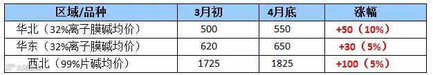 表2 2015年3月初-4月底烧碱市场涨价情况(单位:元/吨)
