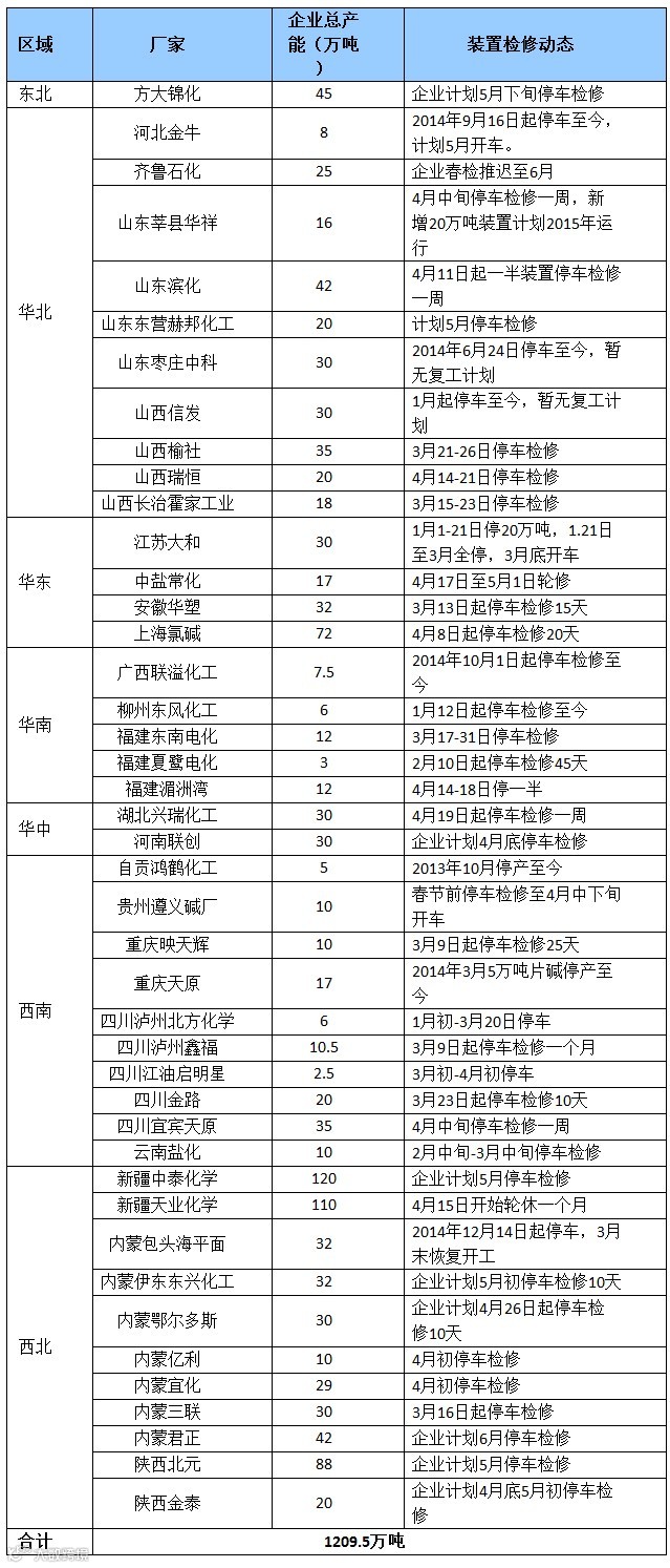 每年4-5月,是氯碱企业装置传统的检修旺季,市场俗称“春检”。据广东塑料交易所行业分析员刘蕊茂不完全统计,2015年春检的氯碱企业将高达40家左右,涉及产能约1209.5万吨,占2014年总产能3910万吨的1/4有余。春检利好也令烧碱行情逐步显露春色,摆脱了自去年年底以来的疲态。