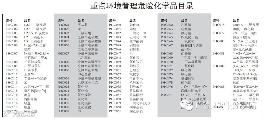 《重点目录》目前共涉及84种危化品。它们均符合下列3种条件之一:具有持久性、生物累积性和毒性;生产使用量大或者用途广泛,且同时具有高的环境危害性和(或)健康危害性;属于需要实施重点环境管理的其他危险化学品,包括《关于持久性有机污染物(POPs)的斯德哥尔摩公约》、《关于汞的水俣公约》管制的化学品等。