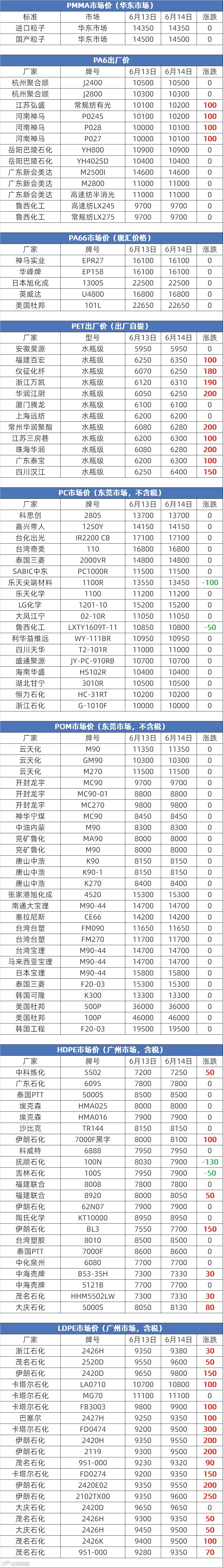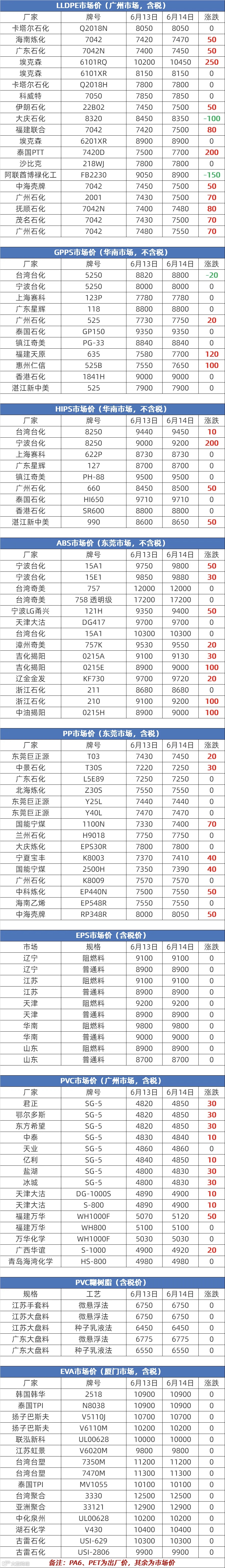 6月14日塑胶原料报价
