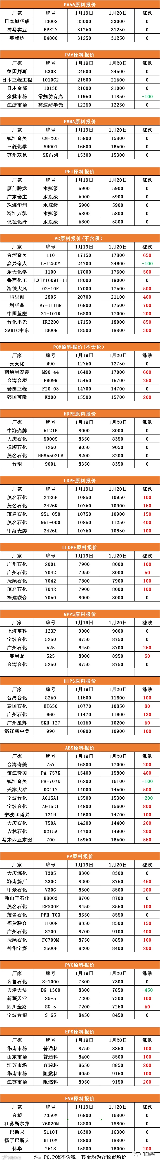 1月20日原料报价