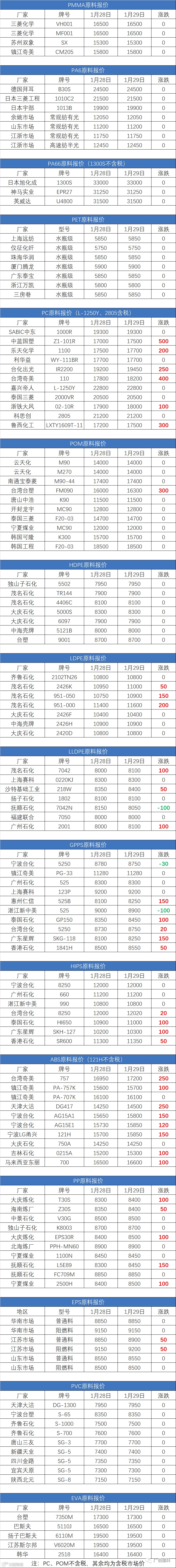 1月29日原料报价