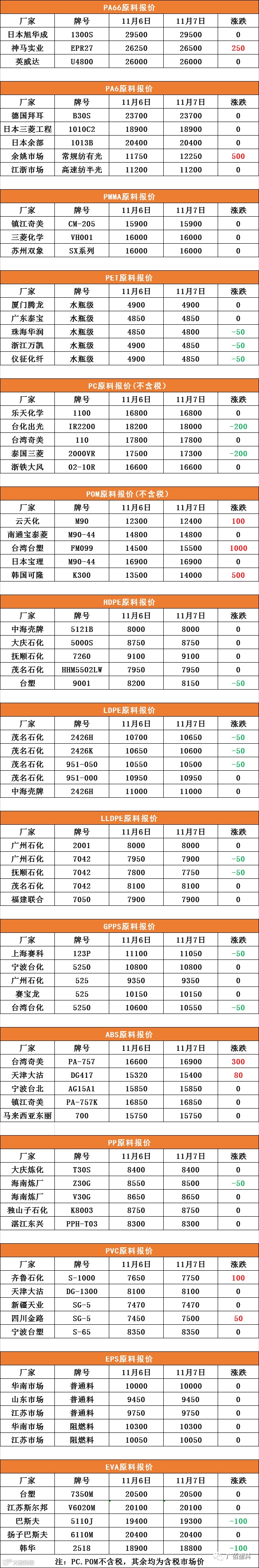 11月7号原料报价表