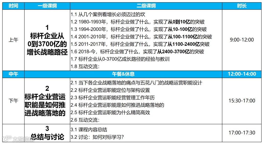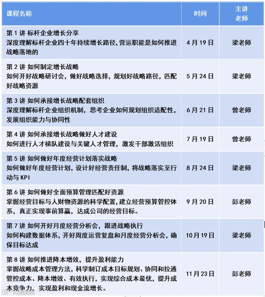 为帮助众多成长型企业对标学美的构建简单高效的经营管理体系,3位原美的战略运营、人力资源、财务管理专家,联袂打造了8堂课说透经营管理体系线下课程,每堂课程时长1天(6小时),具体课程清单如下图示: