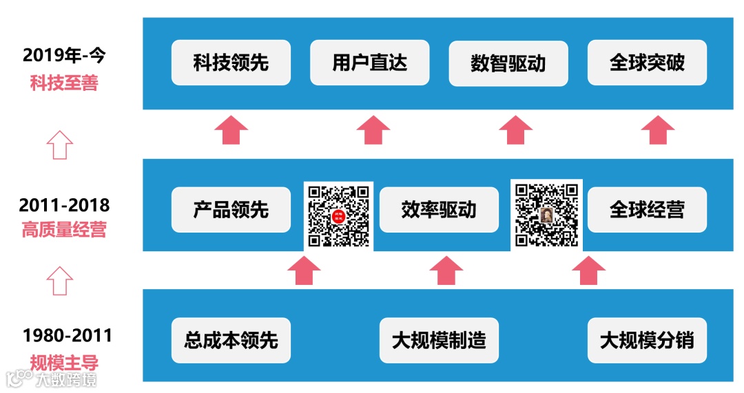 而对于竞争战略的选择,美的过去五十年主要做了2次升级,2011年以前为规模主导、总成本领先战略,更通俗的说就是性比价最优,2011-2018年为产品领先、高质量经营战略,2019年至今为科技领先战略。