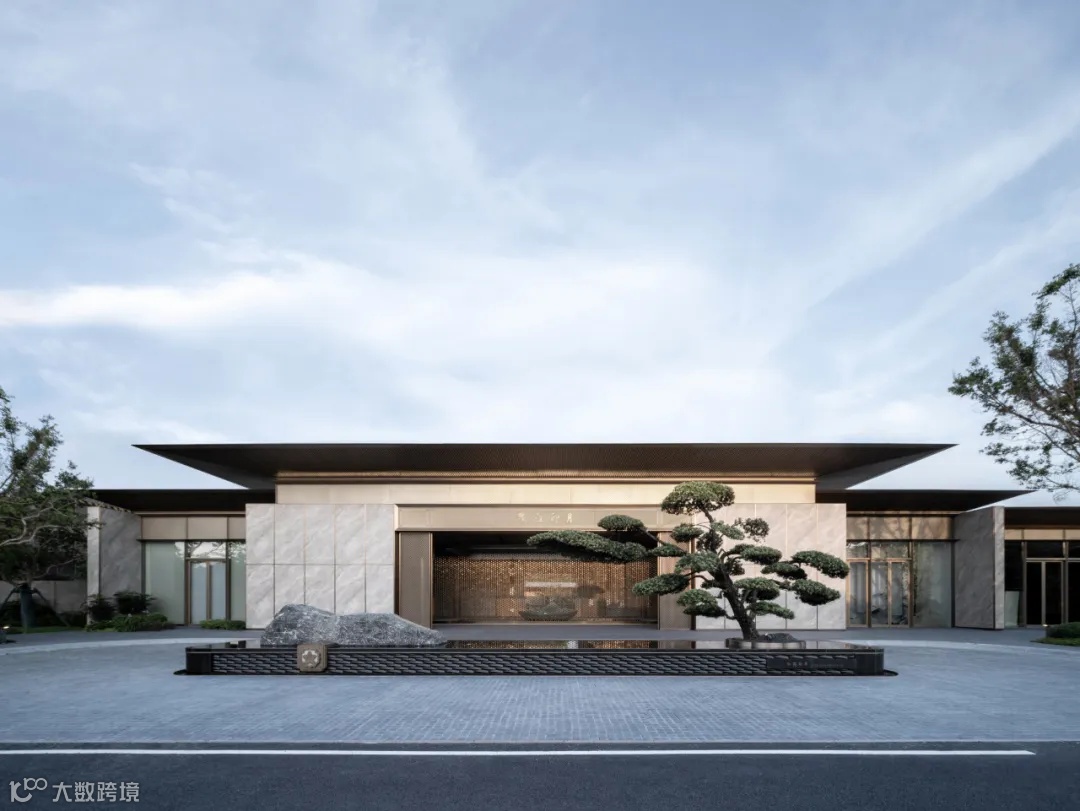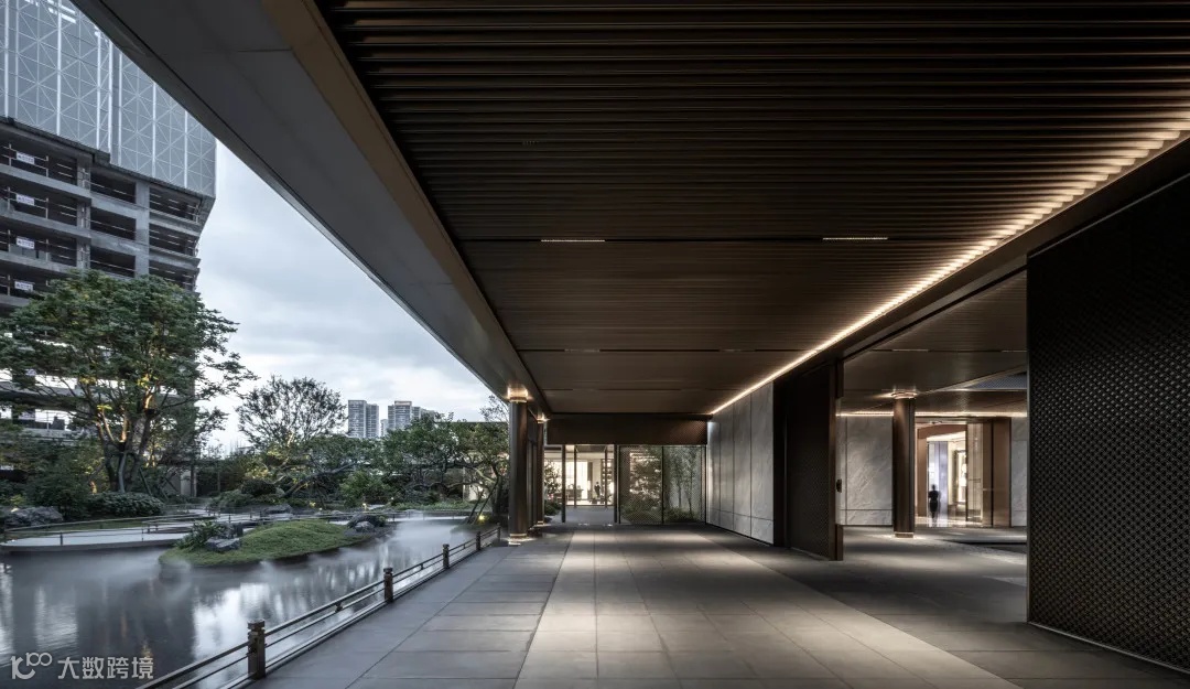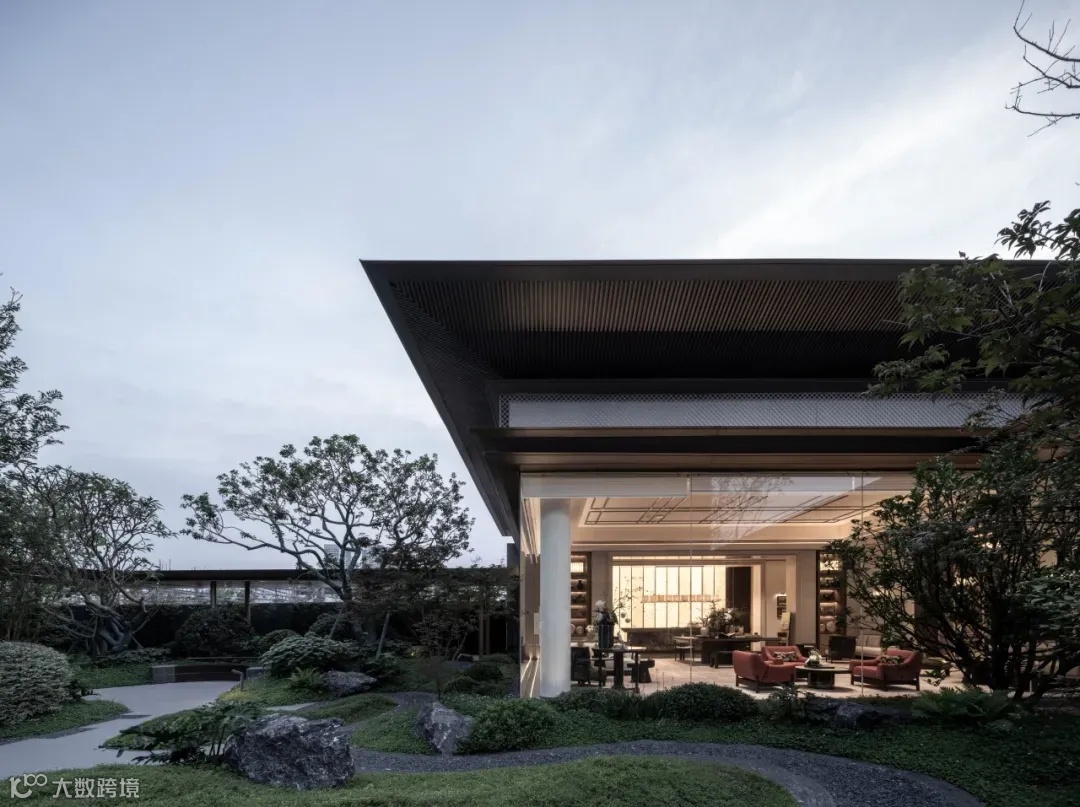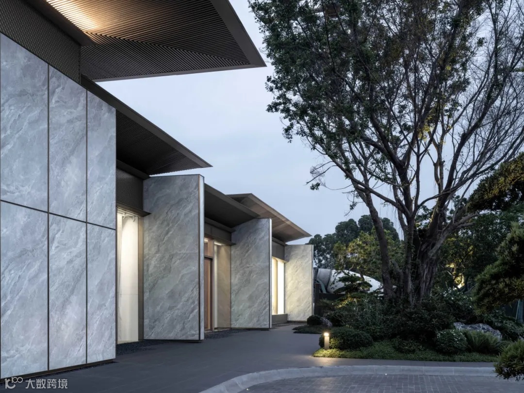 建筑设计整体采用简洁的现代中式风格,设计提取岭南传统府苑建筑的特色形式和文化符号,再进行现代转译,飞檐挑檐、木椽梁架、照壁锦窗都通过现代的建筑语言再现。