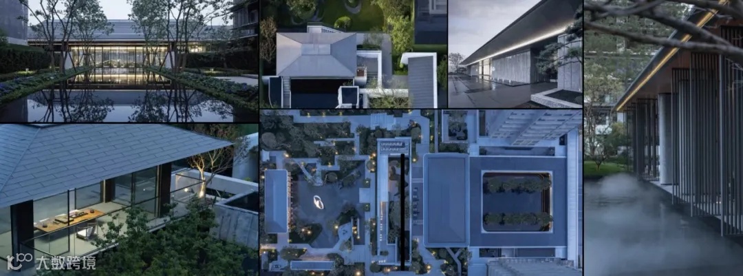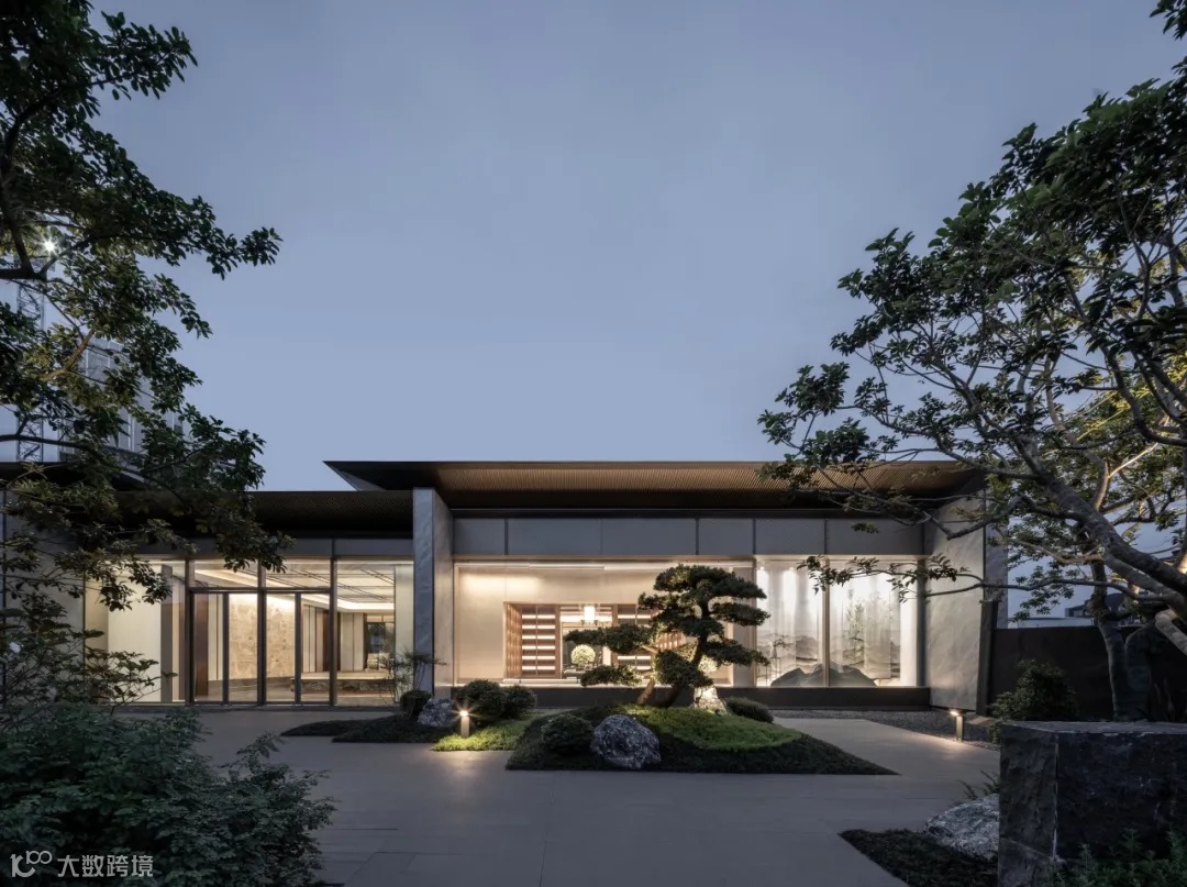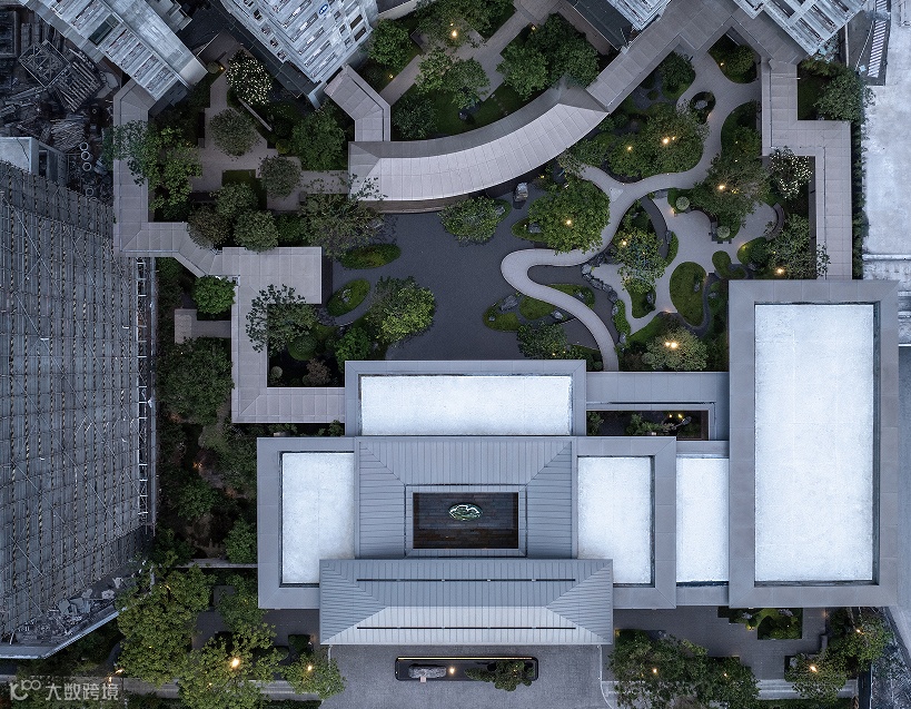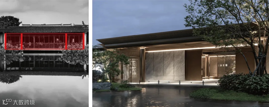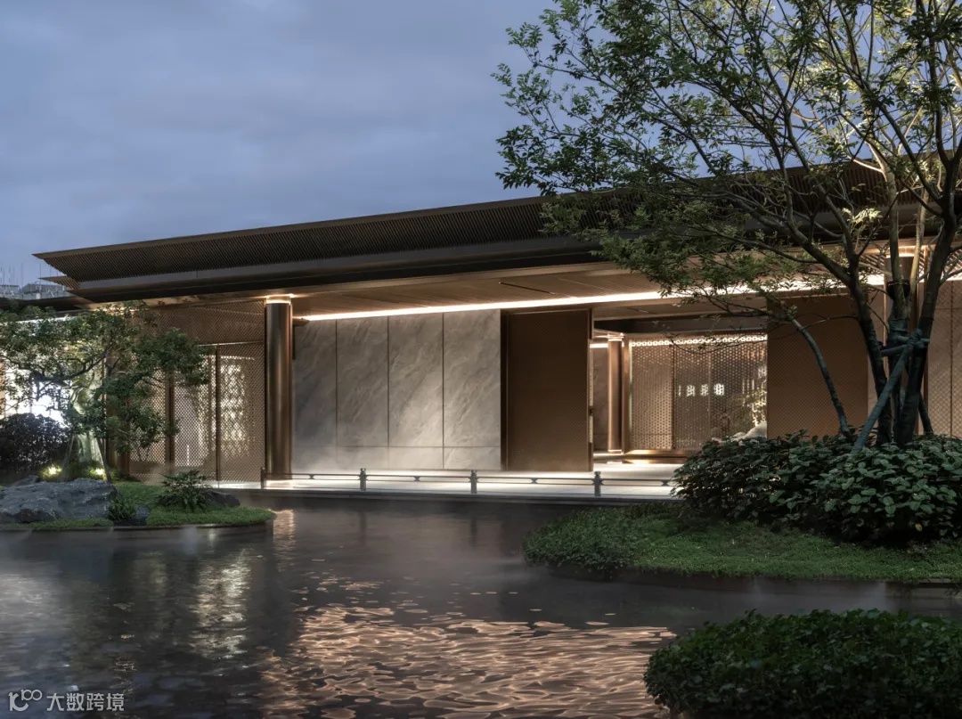 建筑设计整体采用简洁的现代中式风格,设计提取岭南传统府苑建筑的特色形式和文化符号,再进行现代转译,飞檐挑檐、木椽梁架、照壁锦窗都通过现代的建筑语言再现。