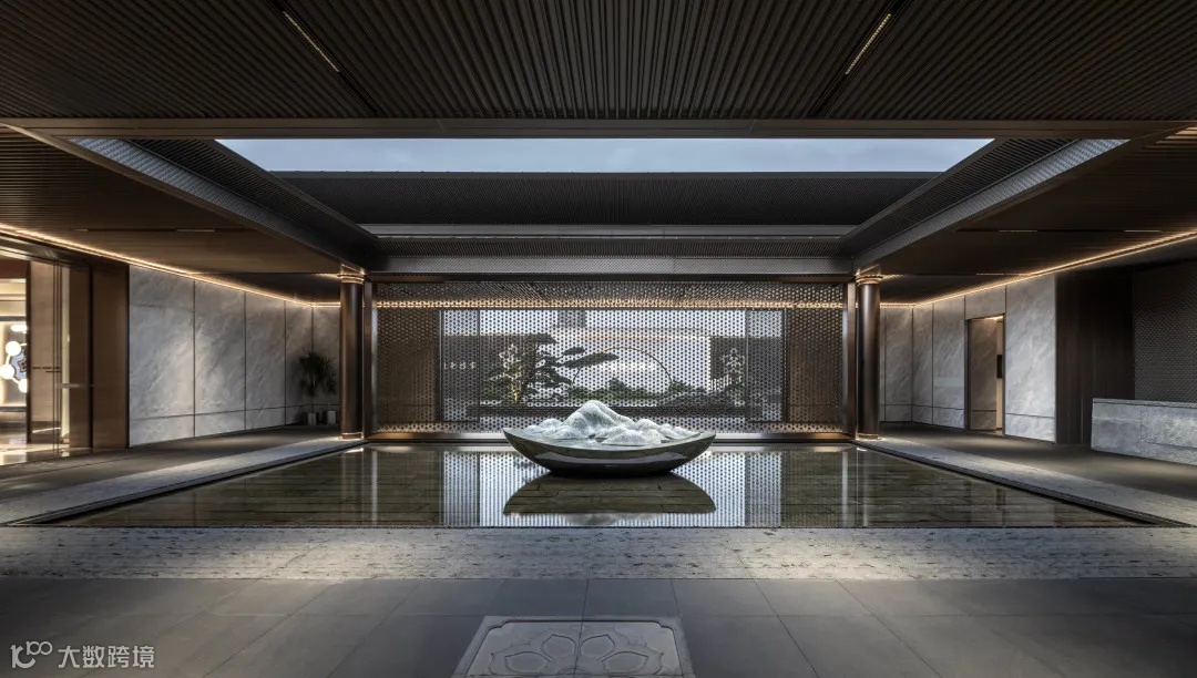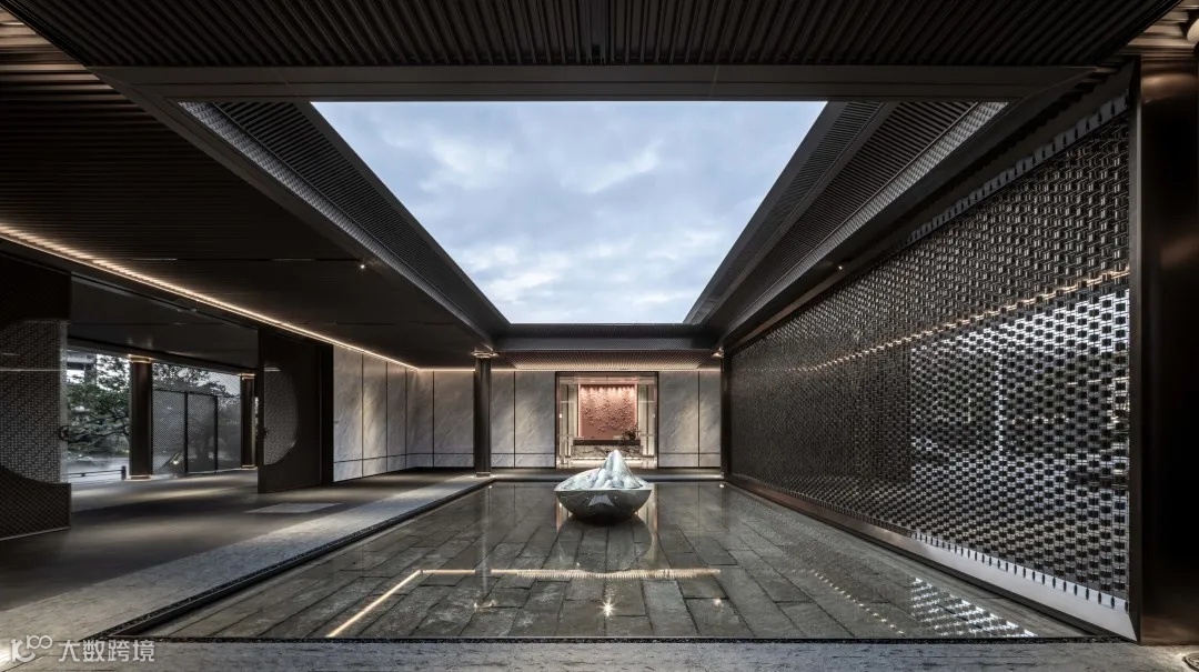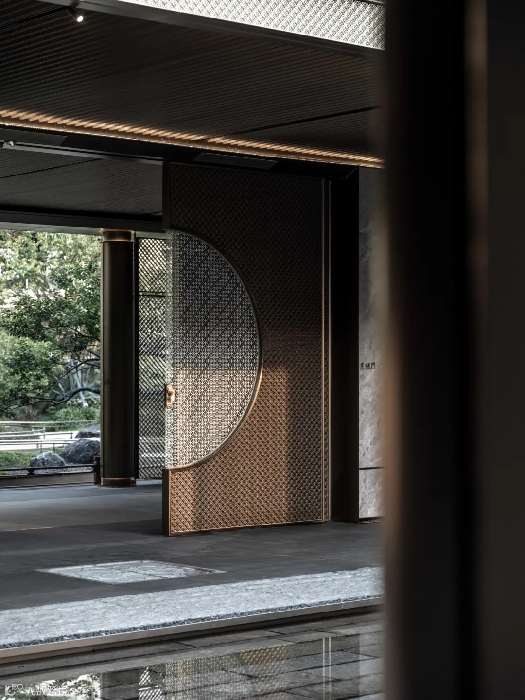 与装置景墙相呼应,在半通透的景墙之后,空间视野隔而不绝,展露而非全显,营造出典雅端庄的东方文化独有韵致。