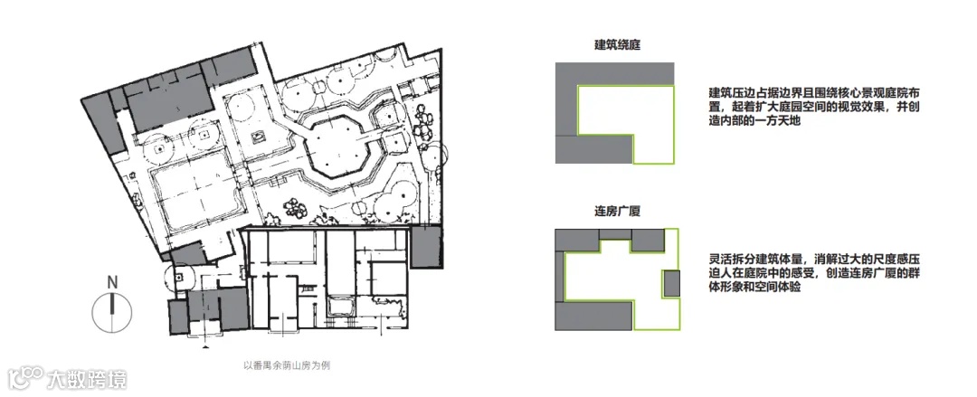 项目借广绣“经巧纬妙”的技法,取山房胜景入园,将「余荫山房」的华丽场景引入作品之中,落成三重归家礼序。规划上以连续的建筑和连廊围合庭院,形成高低错落疏密有致的界面。