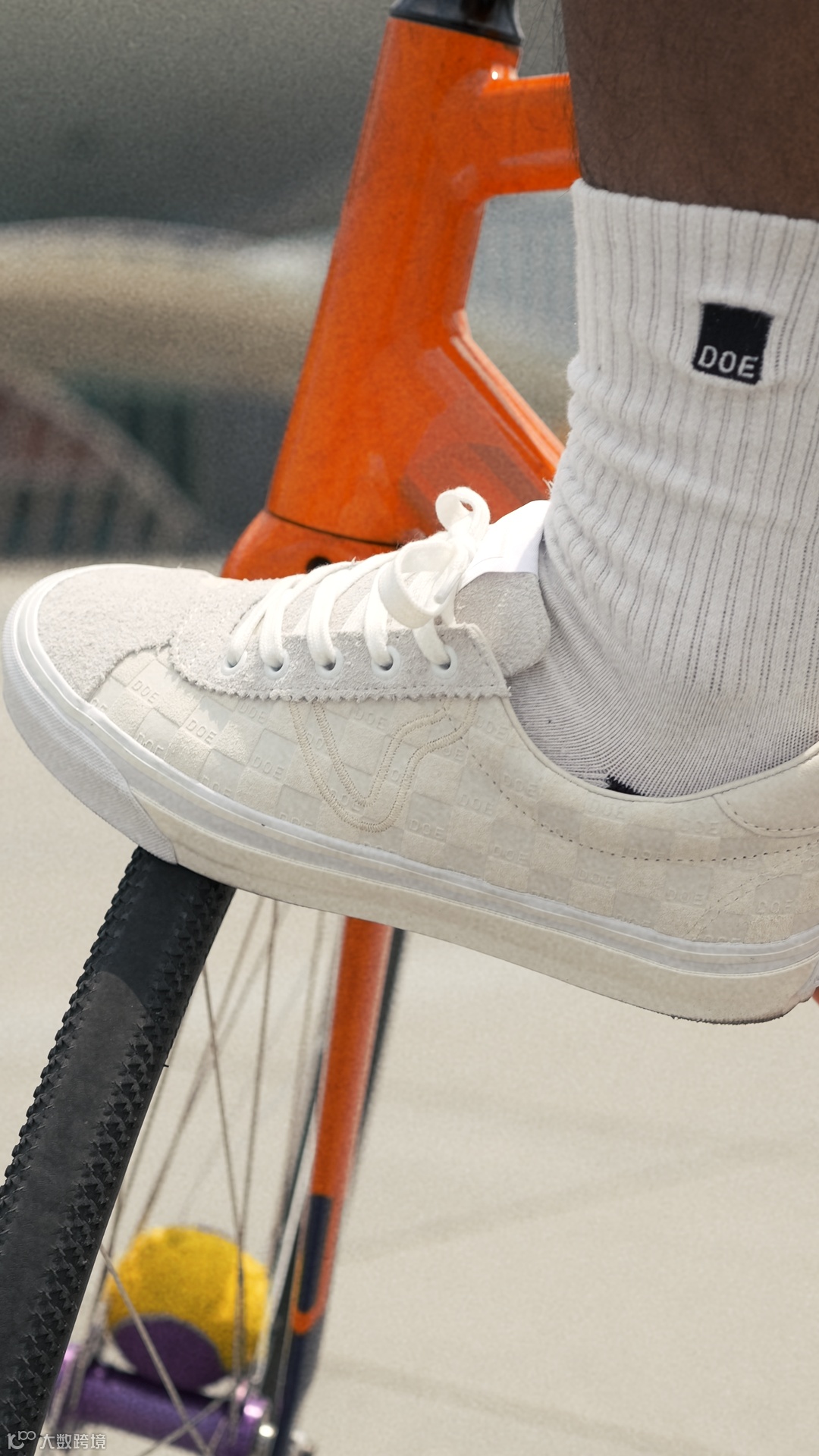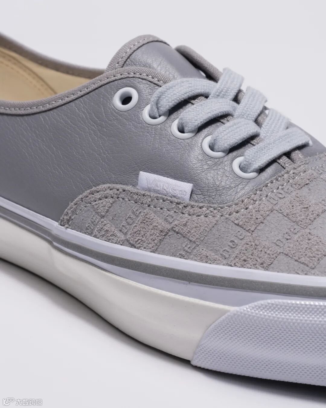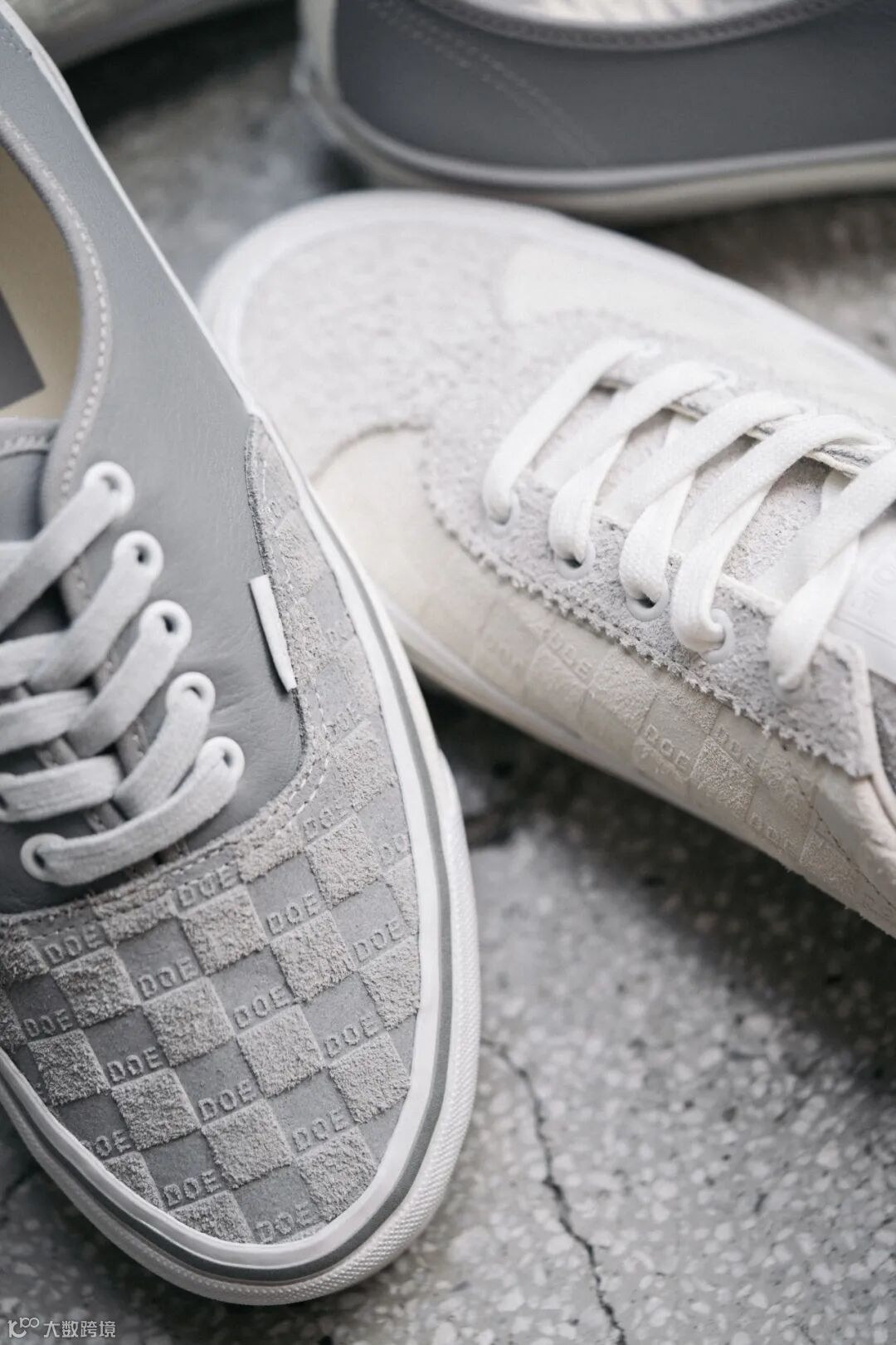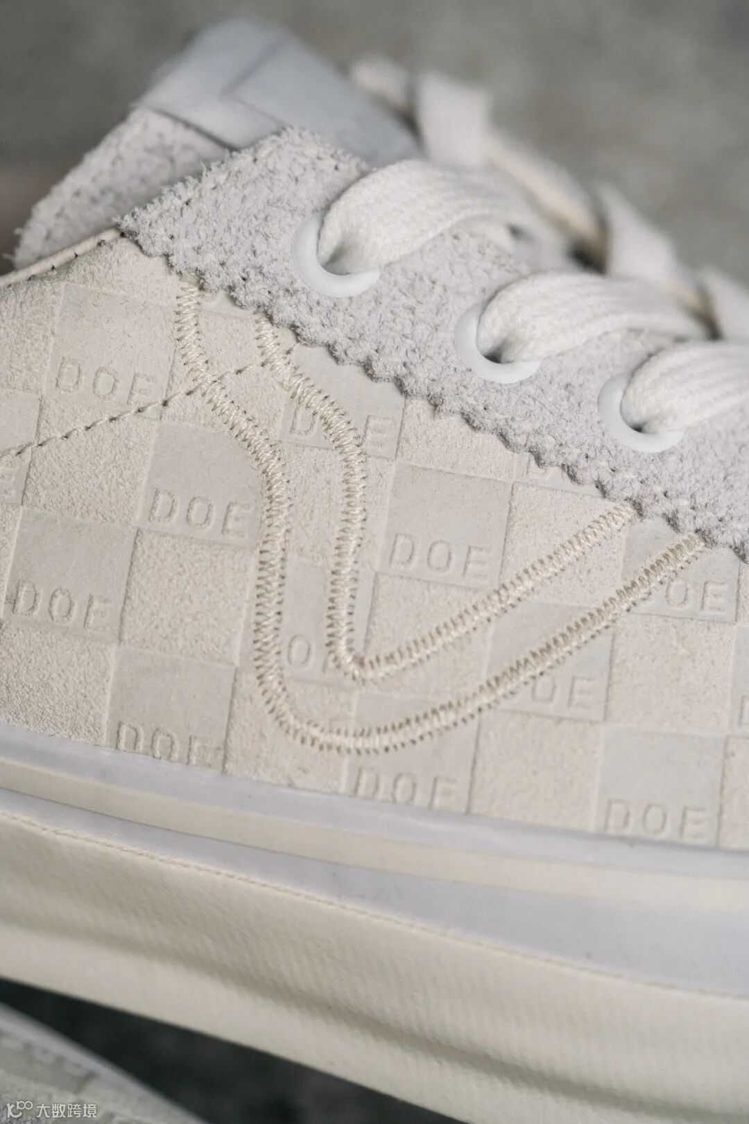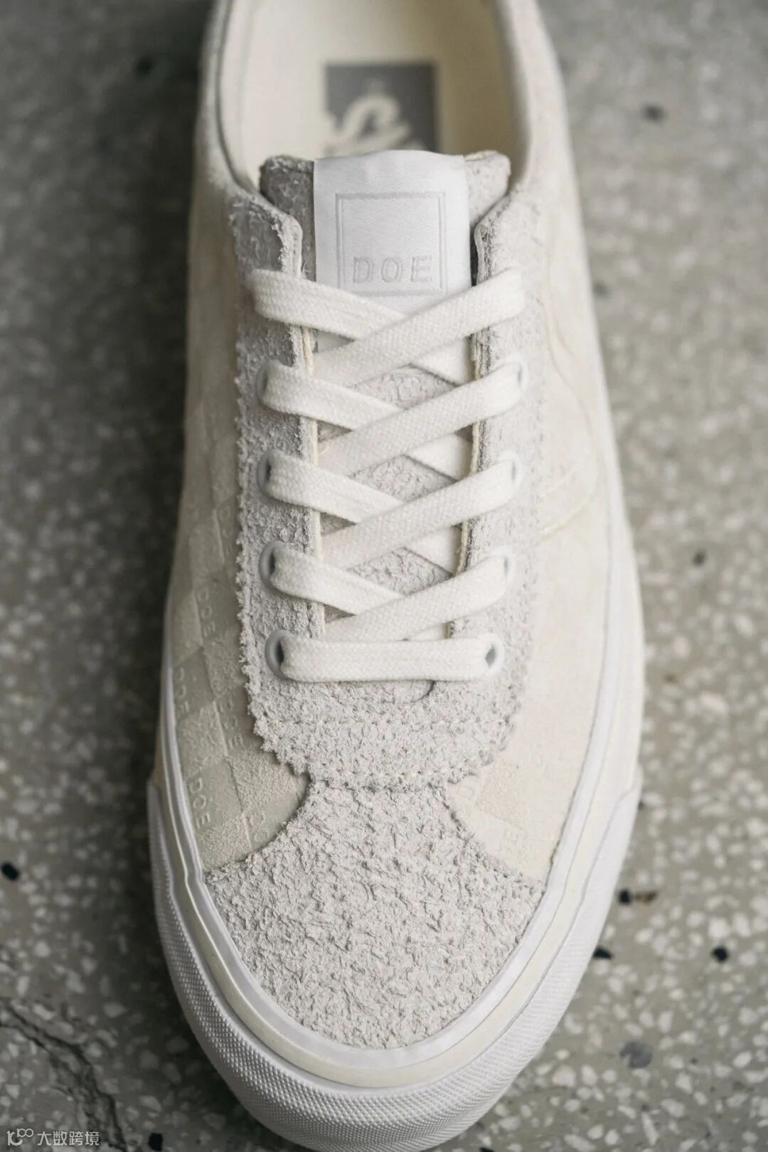 LX Authentic Reissue 44 选取皮革内衬搭配麂皮鞋面,结合棋盘格水晶大底,丰富设计细节。鞋后跟布条以刺绣工艺进行装点,左脚精心绣以 DOE 品牌标志,右脚以 Vans 经典的 Sidestripe 侧边条纹刺绣为点缀,彰显品牌联名属性。
