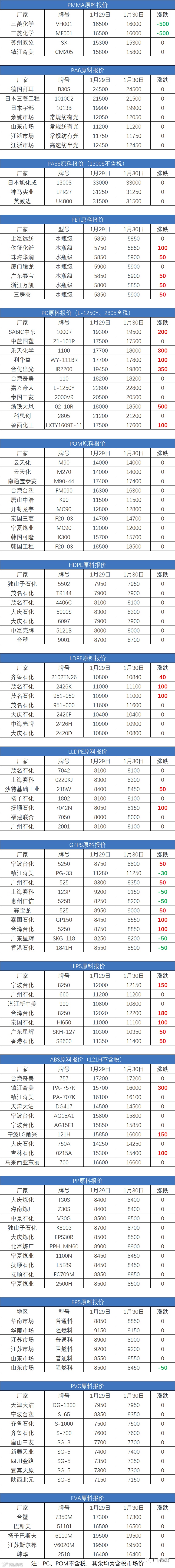 1月30日原料报价