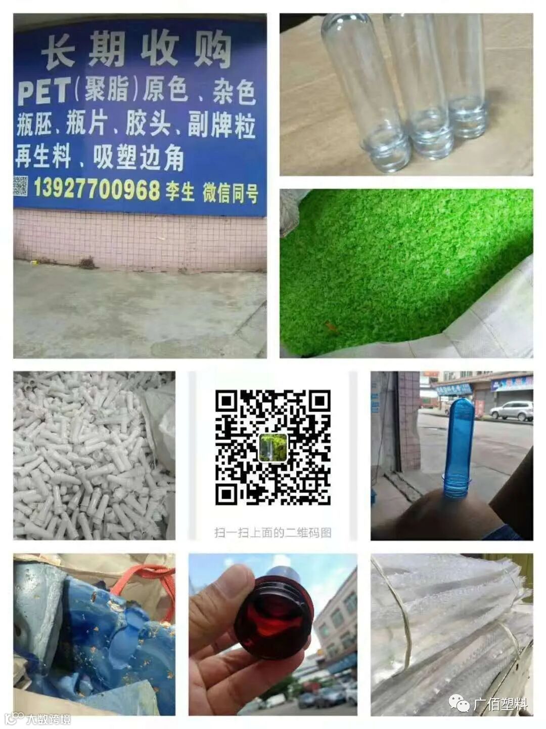 本公司长期大量 收购和销售 原色 杂色 奶白 实色 透明 PET 废瓶胚 和工厂次品PET新瓶、各种颜色的PET胶头、PET 粒料,欢迎各位老板致电1392 7700 968与李先生联系。地址 广东省 佛山市 顺德区。