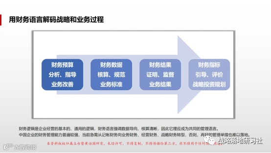 这里面非常关键的就是要用好财务管理工具,用好预算管理这个“抓手”。这些战略规划要用财务的逻辑进行解码、编码。没有这预算管理,从战略到执行,我觉得就是碰运气,经营能力更没办法提高。我经常去很多企业,怎么样评价它的战略执行能力、经营能力?我就看它的财务管理。如果没有预算管理、没有清晰的核算、开不好经营分析会,没有与此对应的绩效考核的话,可能它很多经营管理都是“假动作”。就是说企业还是靠要素资源禀赋,或者说靠老板能力,或者靠高管团队的个人能力,或者资本门槛,总之绝对不能够代表这个公司是有组织能力的、是有经营能力的。一个企业不能有效地使用财务管理工具,推进经营效率改善的话,是不可能提升得了组织能力的。
