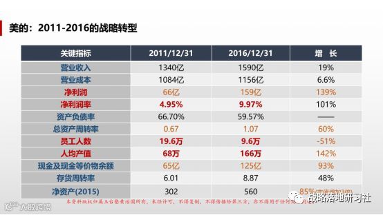 这是我经常举的例子,也是美的在经营管理中一直不断改善与提升的。我们通过看年报数据进行了详细分析了2011年与2016年的数据。从2011年到2016年这五年间,美的其实在经营上也遇到了一些问题,所以整个五年销售增长才19%。这个速度在美的史上是从来没有过的,美的以前每年增长都不会低于这个数。