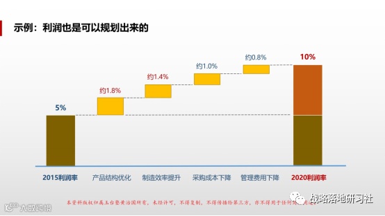 在战略执行的过程中,如果没有一个预算在其中进行详细的测算安排的话,战略是解码不了的,而且绩效考核与评价的依据不知道从哪里来,也无从判断。全面预算的概念不是财务做的一些会计表格,它是把你要做的战略举措、经营举措通过财务的逻辑来进行验证,看到底行不行。因为财务逻辑是企业经营的基本逻辑,任何企业都逃离不了的。比如说我经常讲利润也是可以规划出来的,举一个例子。