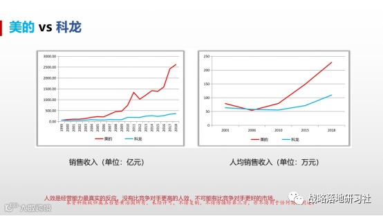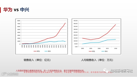 在2000年前后两个企业的规模差不多,但是后面差距就拉开了,而且两条线有非常一致的趋势,一条线是整个销售规模的增长性,另一条线是人均销售的增长性。我们发现,美的的规模逐渐甩开了科龙,而人效也是科龙的两倍。华为的规模与逐渐甩开了中兴,而人效也是中兴的三倍以上。