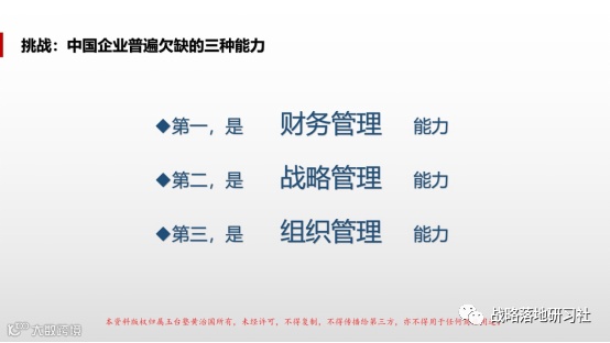 在这种情况下,中国企业的挑战也出现了。这是我最近这些年近距离观察许多中国企业得出的结论,普遍欠缺的三种能力,虽然现在很多专家、企业重视组织能力,但我把这个只排在第三位。在我来看,中国企业普遍欠缺能力中,第一是财务管理能力,其次是战略管理能力,再其次才是组织管理能力。